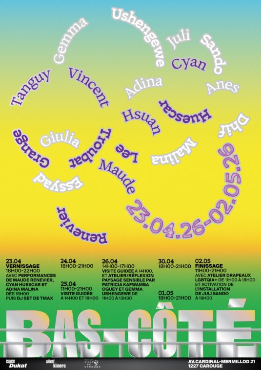 À l’occasion du Printemps Carougeois, l’Espace Dukat accueille Bas-Côté, une exposition collective qui propose de repenser nos manières de faire lien. Inspirée par les réflexions de la philosophe Donna Haraway, l’exposition explore la notion de “familles choisies” et de parentés non traditionnelles. Ici, les liens ne sont pas donnés une […]